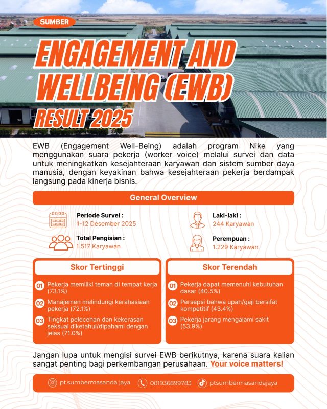 Terima kasih atas partisipasi seluruh responden dalam Engagement and Wellbeing (EWB) Survey 2025 🙌 Survei ini menjadi wadah worker voice untuk mendengarkan aspirasi dan pengalaman kerja, serta sebagai dasar perbaikan berkelanjutan di lingkungan kerja kita. 📊 EWB Survey 2025 Survei ini khusus diikuti oleh TM, TL, dan GL, sebagai bagian dari komitmen perusahaan dalam memperkuat peran kepemimpinan yang inklusif, aman, dan berkelanjutan. Jangan lupa untuk terus berpartisipasi pada survei EWB berikutnya, karena setiap suara sangat berarti bagi perkembangan perusahaan. Your voice matters! #ewb #engagementandwellbeing #workervoice #leadership #sumbermasandajaya #smj Â
